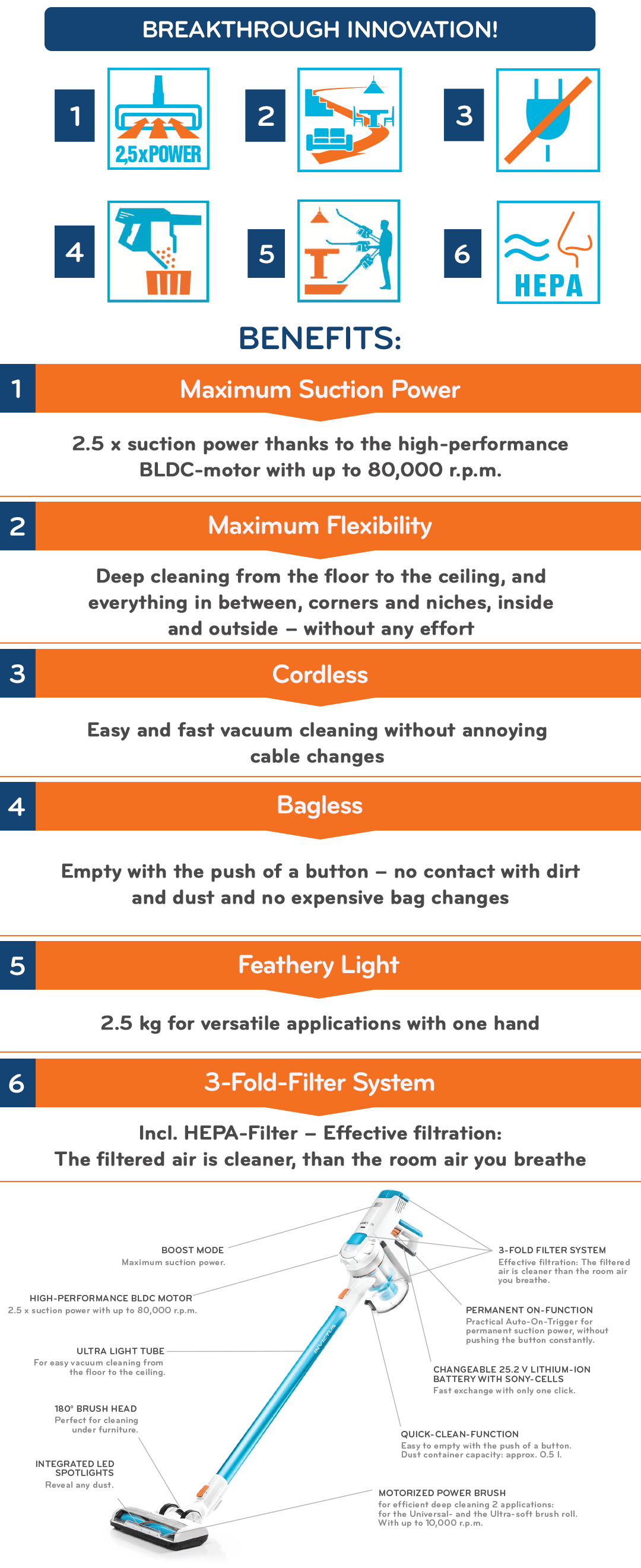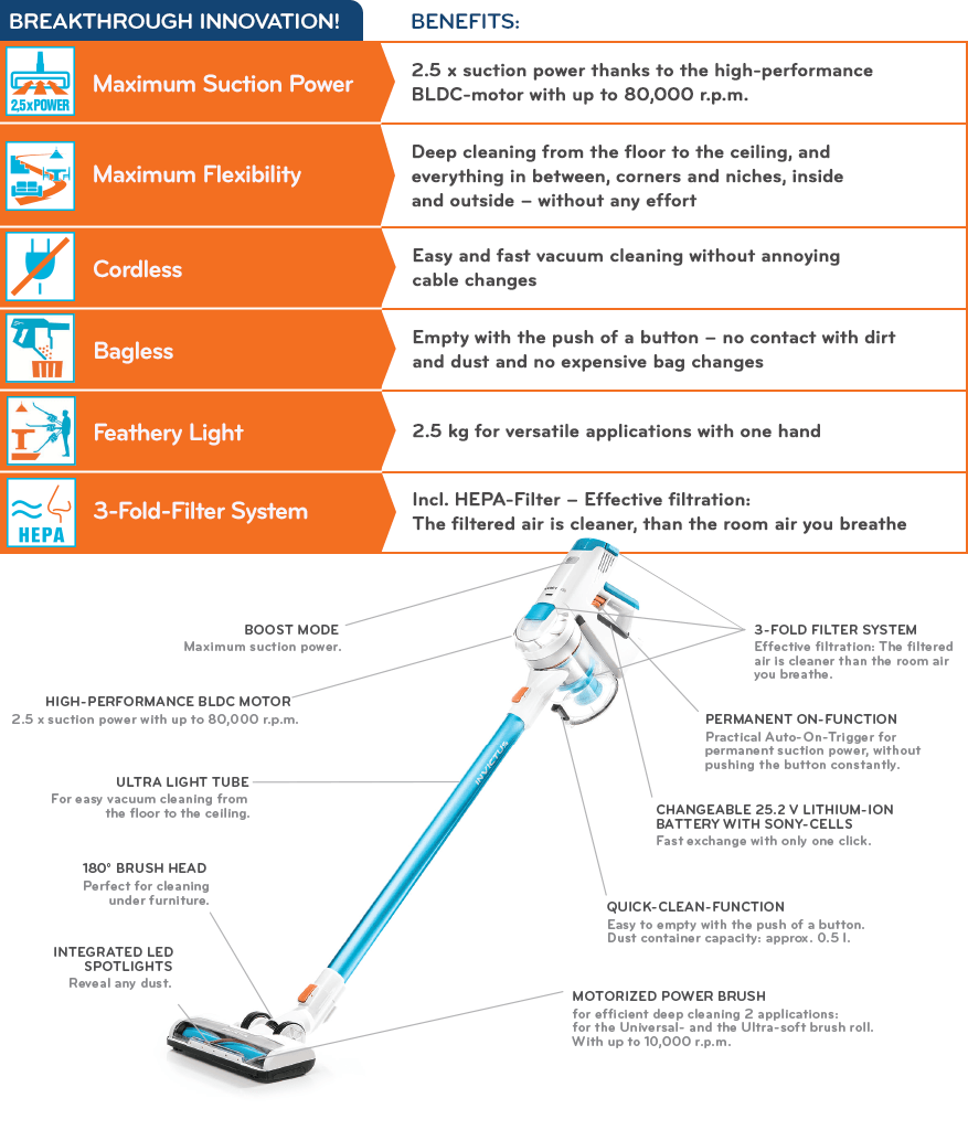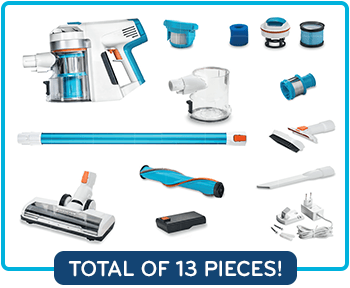 • 1 Main Unit X7 • 1 Dust Container (0.5 l) • 1 HEPA Filter (Air Outlet Filter)
